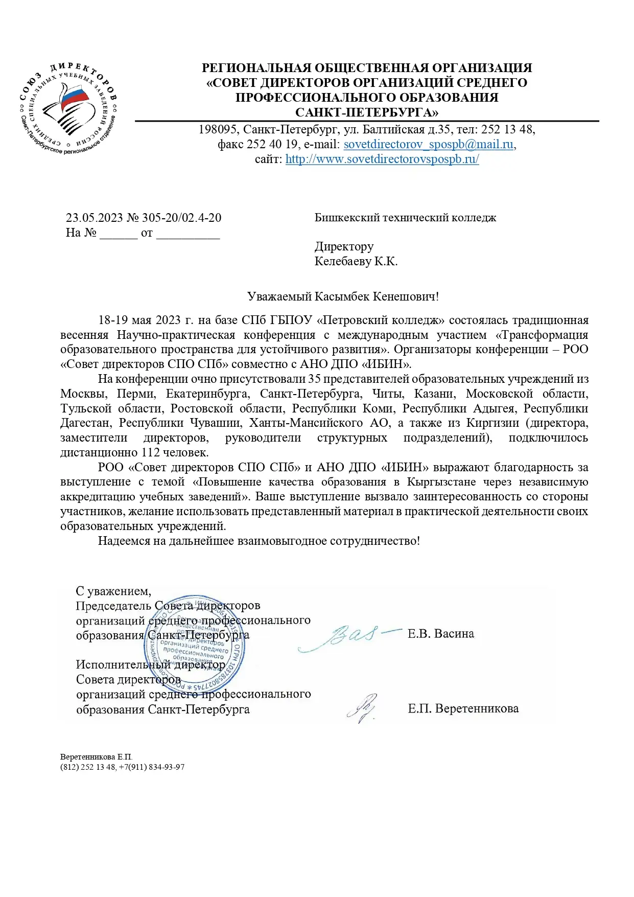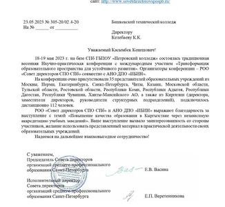 18-19 мая 2023 г. на базе СПб ГБПОУ «Петровский колледж» состоялась традиционная весенняя Научно-практическая конференция с международным участием «Трансформация образовательного пространства для устойчивого развития». Организаторы конференции – РОО «Совет директоров СПО СПб» совместно с АНО ДПО «ИБИН».