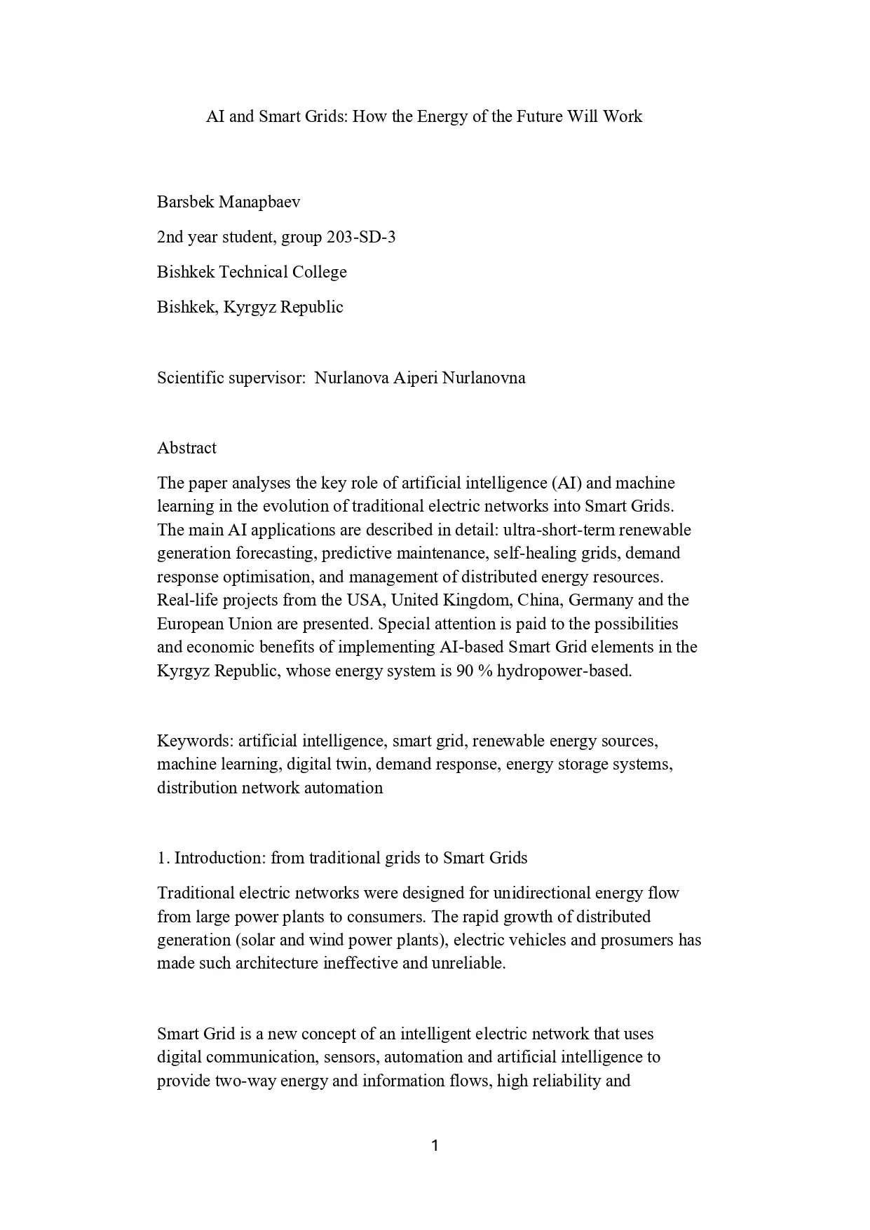 Манапбаев Барсбек англис тилинде “Жасалма интеллект жана акылдуу электр тармактары: энергетиканын келечеги кандай иштейт” деген темада доклад жасады.